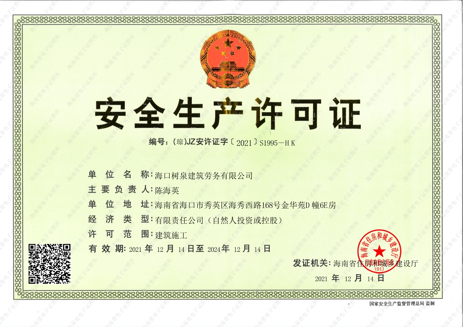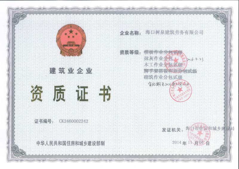海口樹泉建筑勞務有限公司成立于2011年,公司位于??冢淝吧硎且患覍I(yè)建筑施工隊,自2004年即開始在海南從事建筑勞務施工。自成立至今,公司已經擁有一支科學管理、質量過硬、能打硬仗,搶工期的專業(yè)隊伍。能獨立承擔大中型工業(yè)與民用建筑 、室內外裝修、各類機電設備安裝工程。代表工程有海口濱海華庭、三亞時代海岸T01/02/04/05棟高層、合肥東?;▓@二期、陵水富力灣B區(qū)高層、三亞金中海(酒店)、瓊海大印經典花園、海口環(huán)球海景大酒店(四星級酒店,在建中)、陵水珍珠大廈(五星酒店)、??谌f達廣場、美蘭機場二期。